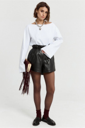 Лонгслив из хлопковой ткани, с горловиной лодочкой и длинным рукавом, слегка расширенным к низу изделия. В комплекте пояс. Длина по спинке 65, длина рукава 63