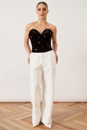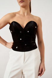 Корсет женский, прилегающего силуэта, выполнен из плотной ткани. Модель с глубоким фигурным вырезом горловины в форме «сердца» (бюстье), без бретелей. Перед и спинка оформлены вертикальными рельефами, в которые вставлены корсетные косточки для создания жесткой формы и подчеркивания талии. Нижний край изделия фигурный, с небольшим удлинением по центру переда. Застежка на потайную тесьму-молнию расположена в среднем шве спинки. Изделие на подкладке, верхний срез обработан обтачкой.