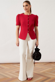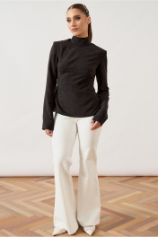 Брюки из плотной костюмной ткани, длинные, силуэта «клёш» от колена. Посадка на притачном поясе. Передние половинки с заутюженными стрелками (или конструктивными швами), визуально вытягивающими силуэт. Застежка классическая на молнию и пуговицу на поясе.