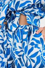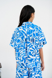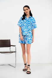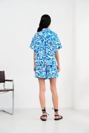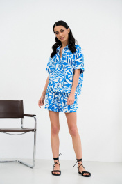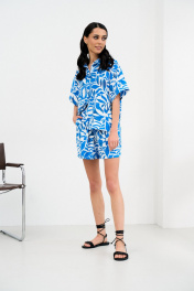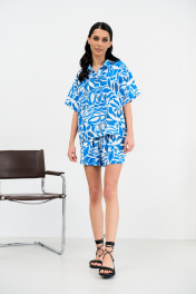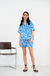 Комплект двойка из лёгкой натуральной ткани, в стильном летнем принте. Комплект состоит из рубашки с коротким рукавом и шорт. Рубашка свободного прямого кроя, по переду застежка на пуговицы. Шорты на резинке, по бокам функциональные карманы Комплект отлично впишется в повседневный гардероб и станет стильным и комфортным образом на жаркую летнюю погоду