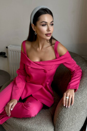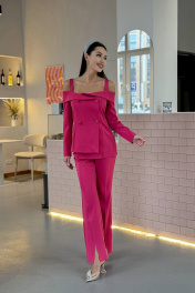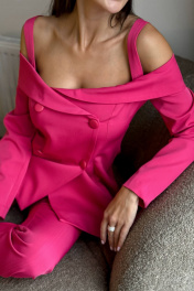 Топ элегантного фасона, бретели съёмные, застёгиваются изнутри на поайные пуговицы. Борта ассиметричные, застёгиватся на 2 ряда пуговиц в цвет изделия, рукав прямой, одношовный. Лиф обработан вырезом, открывающим предплечья.