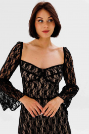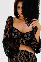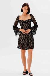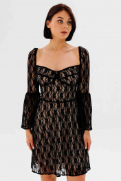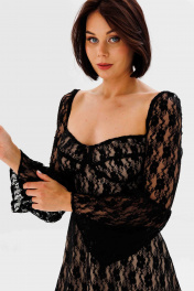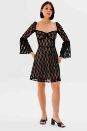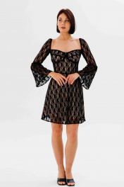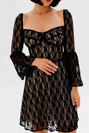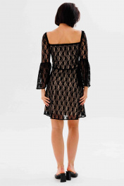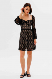 Платье в длине мини, выполнено из эластичного гипюра, обработано трикотажной эластичной подкладкой телесного цвета. Лиф отрезной по т линии талии. Обработаны чашки. Верх рукава собран на резинку. Рукав прямой до линии локтевого сгиба, имеет притачную деталь в форме клеша. Застежка - потаная молния в боковом шве. Юбка широкая по форме полукруг.