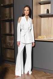 Костюм двойка в белом цвете:жакет с открытыми плечами и брюки-палаццо с волнообразной шлицей.