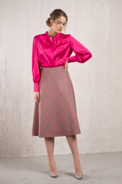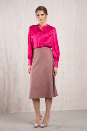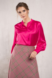Блуза свободного кроя из легкого атласа с матовым блеском. Застежка на пуговицы спереди. Рукав втачной, низ обработан манжетой, застегивающейся на пуговицы. Длина изделия по спинке 61 см, длина рукава 63 см.