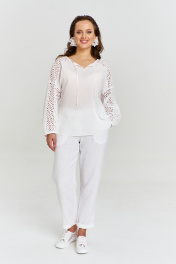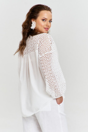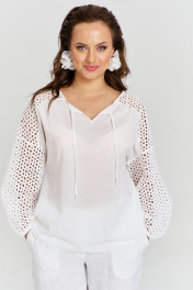 Нежная романтичная блузка из хлопкового ришелье и однотонного компаньена, свободного силуэта, с длинным рукавом и круглой горловиной с V-образным вырезом. Линия плеча спущена, низ рукава присборен на резинку. Вырез с завязками, украшенными бусинами на концах.