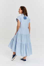 Платье из 100% хлопка с легким крэш эффектом, длиной миди спереди и удлиненной спинкой, с застежкой на пуговицы по переду до низа и рубашечным воротником. Рукав короткий, цельнокроеный, с притачной манжетой. Платье отрезное по линии талии. Низ изделия - сосборенные воланы ярусами. На переде накладные карманы. Изделие декорировано авторскими джинсовыми нашивками с необработанными срезами.