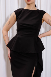 Платье приталенного силуэта с отрезной фигурной баской, переходящей волной в боковой шов. Лиф двойной с декоративной драпировкой. Линия плеча слегка спущеная, что дает возможность скрыть подмышечные складки. В среднем шве спинки обработана потайная застежка-молния. Длина юбки от талии 68 см. Внимание! При выборе размера обратите внимание на параметры изделия: 42 размер - Ог 84, От 65, Об 93; 44 размер - Ог 88, От 69, Об 97; 46 размер - Ог 92, От 73, Об 101, 48 размер - Ог 96, От 77, Об 105; 48 размер - Ог 96, От 77, Об 105; 50 размер - Ог 100, От 81, Об 109; 52 размер - Ог 104, От 85, Об 113.