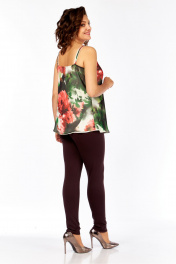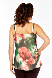 Топ на бретелях полуприлегающего силуэта. Топ двойной верх выполнен из ткани с дизайном, низ однотон. Перед покроен по косой. Бретели регулируются. Длина по боковому-45см.Параметры модели: обхват груди-98см, обхват бедер-110см, размер топа на модели 50.