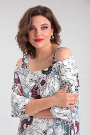 Платье А-силуэта, удлиненное. Верхняя часть платья спущена на плечи, фиксируется широкой резинкой, на плечах есть широкие бретели, закрывающие бретели бюстгалтера. Рукав 3/4 на резинке. Длина по спинке-122см, длина по боку от проймы-109см, длина рукава-49см.