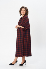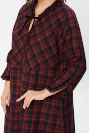 Платье А-силуэта. На переде подрез плавно переходящий в подрез спинки, на переде подрез ниже груди на спинку поднимается выше. Подрез переда и спинки скругленной формы. От подреза спинки по центру платья идет сборка. Вырез V-образный, с небольшим V-образным разрезом, по горловине настрочена рюша, по рюше декоративная, велюровая тесьма, переходящая в завязки. Рукав 3/4 с разрезом, по низу рукава настрочена рюша, с декоративной велюровой тесьмой. В боковых швах есть карманы. Длина плеча - 10,5 см, длина рукава - 57 см, длина по спинке - 130см.