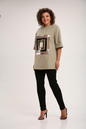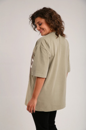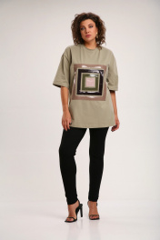Майка свободного силуэта, со спущеным рукавом. Рукав короткий, чуть ниже локтя. По центру переда декор из лаке. Длина плеча-21,5см, длина рукава-29см, длина по спинке-82см.