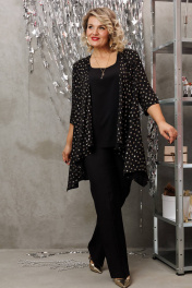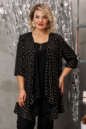 Комплект женский, состоящий из кардигана, блузки и брюк из разных видов ткани. Кардиган распашной,без застёжки, из шифона с дизайном, свободного силуэта, с втачным рукавом 3/4 длины, по переду складывается мягкими складками и углами. Блузка-топ без рукавов, с полукруглым вырезом горловины, свободная, до бёдер. Брюки прямые, широкие, с карманами, на поясе, частично с эластичной тесьмой.