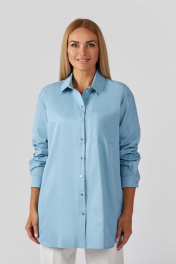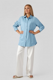 Блузка женская свободного покроя, удлиненная с рубашечным рукавом на манжете по низу,по переду на уровне груди -накладной карман ,застежка спереди на планку с пуговицами ,воротник рубашечный на стойке,низ изделия-фигурный,с закругленными разрезами по боковым швам. Ширина по линии груди блузка(42):54см блузка(44):56см блузка(46):58см блузка(48):60см блузка(50):62см блузка(52):64см Ширина по линии бедер блузка(42):55см блузка(44):57см блузка(46):59см блузка(48):61см блузка(50):63см блузка(52):65см Длина изделия 79,5см Длина рукава 57см