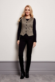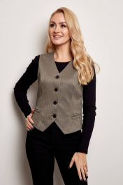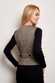 Жилет женский на подкладке из тёплой ткани, с застёжкой спереди на петли и пуговицы, с вертикальными рельефами по перпеду и спинке, с карманами " обманками" по переду, с хлястиком по спинке.