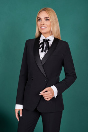 Комплект женский, состоит из жакета, брюк, блузки и бархатной ленты. Жакет прилегающего силуэта, 2-бортный с отрезным воротником "шаль" из отделочной ткани, рукав втачной со шлицей и пуговицами, по переду прорезные карманы "в рамку", слева нагрудный карман, по переду и спинке вертикальные рельефы от проймы до низа изделия, жакет на подкладке. Брюки узкие, прямые со стрелками, на поясе-кокетке со шлевками, застежка спереди на молнию и пуговицы, карманы боковые со скосом, по низу брюк-разрезики. Блузка прилегающего силуэта с рубашечным воротником на стойке, рукав втачной на манжете по низу, застежка центральная на петли и пуговицы, низ изделия фигурный, по спинке вытачки. В комплекте бархатная лента. Ширина по линии груди жакет(42):45см блузка:45см жакет(44):47см блузка:47см жакет(46):49см блузка:49см жакет(48):51см блузка:51см жакет(50):53см блузка:53см жакет(52):55см блузка:55см жакет(54):57см блузка:57см жакет(56):59см блузка:59см жакет(58):61см блузка:61см Ширина по линии бедер блузка(42):48см жакет:49см брюки:47см блузка(44):50см жакет:51см брюки:49см блузка(46):52см жакет:53см брюки:51см блузка(48):54см жакет:55см брюки:53см блузка(50):56см жакет:57см брюки:55см блузка(52):58см жакет:59см брюки:57см блузка(54):60см жакет:61см брюки:59см блузка(56):62см жакет:63см брюки:61см блузка(58):64см жакет:65см брюки:63см Ширина по линии талии брюки(42):35см брюки(44):37см брюки(46):39см брюки(48):41см брюки(50):43см брюки(52):45см брюки(54):47см брюки(56):49см брюки(58):51см Длина изделия (42-46): жакет-67см блузка-64см брюки-102см (48-52): жакет-69см блузка-66см брюки-102см (54-58): жакет-71см блузка-68см брюки-102см Длина рукава жакет-62см блузка-61см