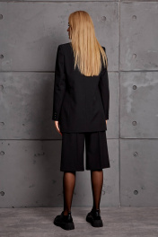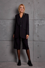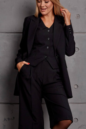 Комплект женский, состоящий из жакета, жилета, брюк-бермудов. Жакет прямого силуэта с втачным рукавом, свободный, с отложным воротником с лацканами с застёжкой на пуговицу, с карманами по переду, на подкладке. Жилет прилегающего силуэта с вертикальными рельефами по переду и спинке, с застёжкой спереди на пуговицы, на подкладке. Брюки- бермуды на поясе, свободные со складками по передним половинкам, с боковыми карманами, длина за колено.