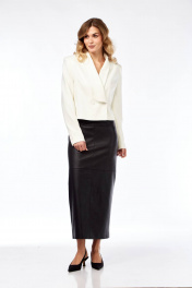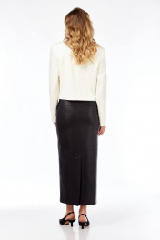 Комплект состоящий, из жакета и юбки. Жакет укороченный прямого силуэта с втачным рукавом и воротником отложным до линии талии, застёжка двух бортная на петли и пуговицы. Изделие на подкладке. Юбка их кожзаменителя узкая прямая, длинная. По заднему полотнищу шлица и застёжка в среднем шве. По переду карманыв подрезах.