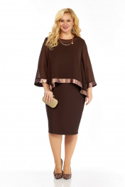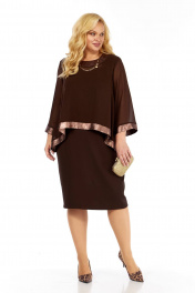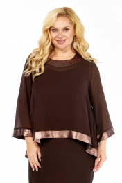 Нарядный женский двухпредметный комплект состоит из блузы ,выполненной из шифона двух видов,и платья,выполненного из однотонной плательно-костюмной ткани. Платье полуприлегающего силуэта,без рукавов. Перед с нагрудными вытачками из проймы.Спинка со средним швом, заканчивающимся шлицей,и талиевыми вытачками.Вырез горловины -фигурное каре , обработан обтачкой.Проймы окантованы бейками. Блуза силуэта трапеция с втачными одношовными рукавами длиной 3/4,выполнена из гладкого шифона. Спинка удлиненная к центру, со средним швом и застёжкой на навесную петлю и пуговицу.Обтачка горловины переда,планки по низу блузы и рукавов, выполнены из отделочного шифона с бронзовым принтом