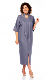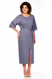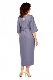 Женское нарядное платье выполнено из плательно-костюмной однотонной ткани с блестящим напылением. Перед со средним швом, заканчивающимся разрезом.Спинка цельная.Рукава цельнокроеные с широкими двойными манжетами, длиной 3/4.Вырез горловины по переду круглый ,а по спинке V-образный с планкой и декоративной пластинкой, обработан обтачками. Платье укомплектовано поясом-завязкой из основной ткани с декоративной металлизированной бахромой на концах. Высота разреза: 39см