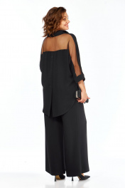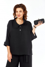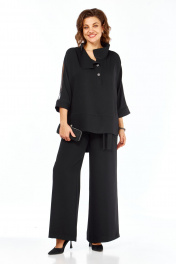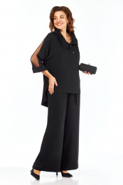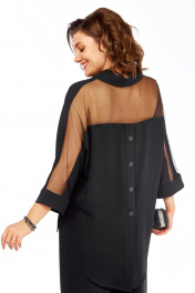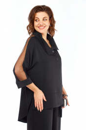 Женский двухпредметный костюм состоит из свободной блузы и широких брюк,выполнен из однотонной плательно-костюмной ткани. Блуза прямого силуэта, "оверсайз", с цельнокроеным рукавом длиной 3/4, заканчивающимся притачной манжетой, выполнена из двух видов ткани. Перед с притачной горизонтальной планкой по низу, разрезами в боковых швах и втачной планкой по горловине, застёгивающейся на 2 кнопки. Воротник - стойка. Спинка удлиненная,с отрезной кокеткой из сетки, нижняя часть спинки с центральной застёжкой на 4 кнопки.Низ спинки фигурный. Брюки прямого силуэта, с декоративными хлястиками, застёгивающимися на кнопку, по переду. Брюки на притачном поясе с резинкой по спинке.