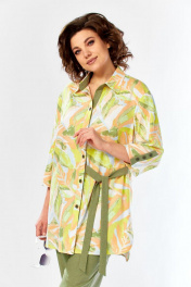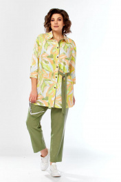 Женский двухпредметный комплект состоит из рубашки и брюк, выполненых из двух видов ткани. Рубашка прямого силуэта,​ выполнена из натуральной плательно-костюмной ткани с оригинальным акварельным дизайном.Рубашка с центральной застёжкой на 5 петель и пуговиц с отложным воротником на отрезной стойке рубашечного типа. Перед с нагрудными вытачками от боковых швов и отрезными вертикальными планками. Слева в районе талии выполнен декоративный пояс-завязка . Спинка цельная удлиненная. Рукава втачные двухшовные длиной 3/4. В локтевых швах выполнены декоративные элементы с 3 декоративными пуговицами. Низ рубашки фигурный.​ В боковых швах разрезы. Стойка воротника, нижняя центральная планка, пояса и декоративные элементы на рукавах выполнены из ткани брюк. Брюки выполнены из однотонной плательно-костюмной ткани с содержанием льна. Брюки зауженные к низу, укороченные,с вытачками по низу . Пояс притачной на резинке по кругу, только центральная часть пояса без сборки. В боковых швах карманы с отрезными бочками. Спереди выполнен декоративный гульфик.