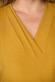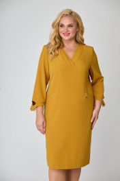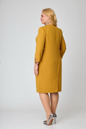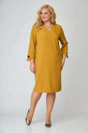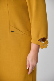 Платье женское полуприлегающего силуэта. Полочка с рельефами переходящими в подрезы. Подрезы декорированы фигурными листочками. Горловина платья V-образной формы, подчеркнута декоративными элементами. Спинка со средним швом, в котором предусмотрена шлица. Рукав втачной одношовный с низом фигурной формы. Обработан узким манжетом с декоративной пуговицей.