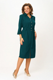 Платье полуприлегающего силуэта из плательной ткани, длины миди. Перед платья отрезной по линии талии, с центральной застежкой на петли и пуговицы. Имеется объемный пояс с пряжкой, который продет в декоративные шлевки по переду. Горловина платья фигурной формы с воротником рубашечного типа. Перед с рельефами выходящими из проймы до горизонтального подреза по талии. Нижняя часть переда платья с талиевыми вытачками и средним швом, в котором предусмотрен разрез. Есть фигурные карманы. Спинка платья со средним швом и талиевыми вытачками. Рукав втачной, двухшовный, на манжете с застежкой на петлю и пуговицу.