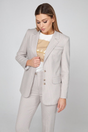 На передовой моды: модный однобортный жакет полуприлегающего силуэта с приятным рисунком в мелкую гусиную лапку, стильно подчёркнутый сочетанием карманов и интересным расположением пуговиц по борту. Приятная испанская ткань с добавлением вискозы прекрасно держит форму и обеспечивает свободу движений и комфорт. Рукава втачные двухшовные. На подкладке. Универсальный компаньон для множества нарядов.