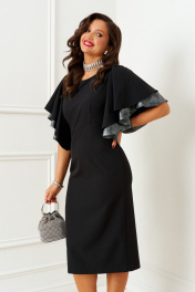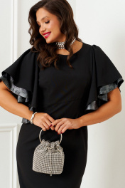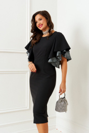 Воплощение вечной классики! Контраст мягкой асимметрии и тонких изгибов, пересечение оттенков и фактур – то самое платье для зимних праздников. Одеваем и наслаждаемся. Платье женское прилегающего силуэта средней длины, выполнено из костюмно-смесового полотна с декоративной отделкой. Перед платья с наклонным подрезом на талии, а также с вертикальными вытачками от него. Спинка разрезная по среднему шву, в верхней части которого вставлена длинная потайная молния, и выполнен разрез, фиксируемый на навесную петлю и пуговицу, а снизу – шлица. Так же на спинке присутствуют две вертикальные вытачки на талии. Горловина овальной формы. Рукав короткий двойной фантазийной формы. Выполнен из двух видов ткани: основной и отделочной.