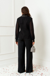 Симфония роскоши и фактур! Сочетание приталенного жакета и широких брюк создает гармоничный силуэт, подчеркивая достоинства фигуры. Костюм женский 2-ух предметный: жакет и брюки в деловом стиле. Выполнен в комбинации изысканных костюмного, атласного и шифонового полотен, а также декорирован эксклюзивной цепочной тесьмой. Жакет прилегающего силуэта, асимметричный, длиной до середины бедра. На подкладке. Передняя часть с вертикальными рельефами от проймы. Правая часть отрезная по линии талии, имеет скошенный борт и неровный низ. Спинка с центральным швом и с вертикальными рельефами от плеча. Рукав втачной, одношовный, длинный. Расширенный и собранный внизу, на притачной манжете. Воротник пиджачный, шалевого типа, асимметричный. Застежка смещенная на петлю с декоративной пуговицей. Брюки прямого силуэта классической посадки, длинные, с двумя верхними боковыми карманами. Высота сиденья стандартная. Застежка центральная на молнию и на петлю и пуговицу на поясе. В задней части пояса для удобного прилегания по талии вставлена резинка.