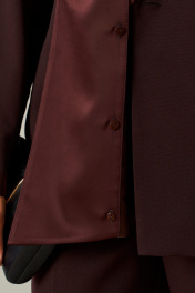 Удобство брючного костюма – неоспоримый факт, проверенный жизнью. Костюм женский 2-ух предметный: жакет и брюки в деловом стиле. Выполнен из костюмной ткани в сочетании с атласным полотном нежной и блестящей фактуры. Жакет классический полуприлегающего силуэта длиной ниже бедер. На подкладке. Передняя часть с вертикальными рельефами от проймы. На левой части переда выполнена верхняя листочка из ткани компаньона. На правой части переда скошена линия борта, из-под которой выглядывает отделочный элемент. Спинка с центральным швом и с вертикальными рельефами от проймы. Рукав втачной двухшовный длинный. Воротник пиджачного типа с лацканами. Застежка центральная однобортная на петлю и декоративную пуговицу. Жакет дополнен съемным отделочным элементом в виде воротника с лацканом на правой стороне из ткани компаньона. Брюки прямого силуэта классической посадки, длинные, с двумя верхними боковыми карманами. Высота сиденья стандартная. Застежка центральная на молнию и на петлю и пуговицу на поясе. В задней части пояса для удобного прилегания по талии вставлена резинка.