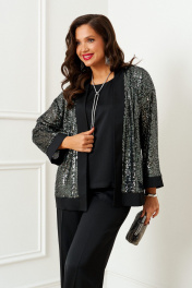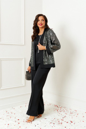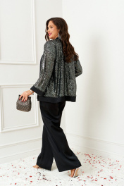 Брючный комплект в комбинации сияющего роскошного атласа с эксклюзивным полотном с пайетками не останется незаметным в главную новогоднюю ночь! Блузон свободного силуэта, напоминающий кардиган, с удлиненной линией плеча. Перед с нагрудными вытачками от бокового шва. Спинка цельнокроеная. Рукав рубашечный одношовный длиной 7/8 на притачной манжете из ткани компаньона. Нижняя часть блузона и борта обработаны притачной планкой из ткани компаньона. Брюки свободного силуэта прямые, с двумя верхними боковыми функциональными карманами. Высота сиденья классическая. Застежка центральная на молнию и на петлю с пуговицей на поясе. Брюки на поясе, в задней части которого для удобного прилегания по талии вставлена резинка. Топ полуприлегающего силуэта. Перед цельный, с двумя нагрудными выточками от бокового шва. Спинка разрезная по среднему шву, в верхней части которого предусмотрен небольшой разрез для застежки на одну навесную петлю с пуговицей; с вытачками на талии. Горловина округлой формы. В боковых швах выполнены разрезы.