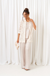 Комплект с блузкой из кружева, брюк и топа – изделие вне времени и трендов, созданное в различных интерпретациях: от оверсайза до классики. Предназначен для повседневного и выходного использования. Найдет применение в любую погоду. Блузка свободного силуэта выполнена из смесового полотна с содержанием вискозы. Передняя часть из двух половинок с нагрудными вытачками от бокового шва. Спинка цельная. Рукав одношовный втачной длиной ¾ свободный. Воротник классический стояче-отложной на цельнокроеной стойке. Без застёжки. Низ изделия ровный, в боковых швах предусмотрены высокие разрезы. Топ полуприлегающего силуэта, выполнен из тонкого смесового вискозного полотна. Перед цельный, с двумя нагрудными вытачками от бокового шва. Спинка цельная. Горловина округлой формы. Низ слегка закруглен к боковым участкам. Брюки длинные, прямые свободные; выполнены из смесового вискозного полотна. Посадка классическая, высокая. Застежка центральная на молнию и петлю с пуговицей на поясе. Спереди расположены боковые функциональные карманы. Пояс притачной, сзади на резинке, шириной 4см.
