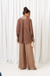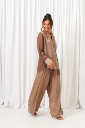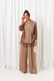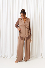 Стильный свободный нарядно-повседневный женский комплект, дополненный акцентными деталями, весьма актуален в будущем сезоне. Комплект состоит из 2-х предметов одежды: рубашки и брюк. Выполнен из легких и струящихся тканей мягких оттенков с содержанием натуральных волокон. Брюки и верхняя деталь, имитирующая жилет, из шелковистого полотна. Рубашечная часть комплекта из шифоновой ткани. Рубашка прямого силуэта свободного базового кроя. Перед двойной: из симметричных деталей внутренней рубашки и свободного внешнего жилета. На жилете расположены нагрудные вытачки от боковой линии и слева вверху настрочена декоративная деталь-листочка. Спинка цельная по середине, имеет двойную фигурную обтачку-кокетку из отделочной ткани и мягкую встречную складку от неё. Рукав рубашечный одношовный полной длины с мягкими складками по низу от притачной манжеты. Манжет застегивается на две декоративные пуговицы. Застёжка смещенная на видимую отделочную завязку на жилете и внутреннюю потайную. Воротник классический отложной пиджачного типа с лацканами. Низ слегка округлой формы с поднятием к боковым участкам. Брюки свободного, прямого силуэта. Высота сиденья классическая. Спереди на талии заложены глубокие складки. Брюки на поясе, в который вставлена эластичная тесьма по всей окружности.