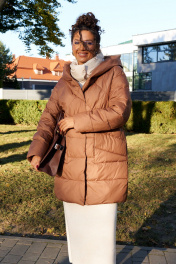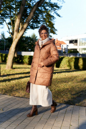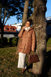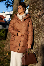 Это пальто станет акцентным элементом вашего гардероба. Современный объёмный крой и спущенная линия плеч создают расслабленный актуальный силуэт. А широкий воротник играет роль дизайнерского акцента. Пальто выполнено из прочной, влагостойкой и приятной на ощупь полиэстерной ткани; на синтетической подкладке. Утеплитель холлофайбер 200 г/м. кв. предназначен для использования изделия при температурном режиме от -10 до -20 градусов. Модель прямого силуэта, с удлиненной линией плеча; предназначена для повседневной носки. Перед с кокеткой на уровне талии и с асимметричными боковыми карманами, фиксируемые на кнопку, от нее. Правый карман с широкой обтачкой и декоративным элементом в виде металлической цепочки. Спинка с кокеткой чуть выше линии груди. Рукав длинный втачной двухшовный. По низу внутри рукава предусмотрена дополнительная вставка в виде притачной трикотажной манжеты. Воротник стойка в виде отделочной детали контрастного цвета с возможностью застегивания до верха с помощью вшитых магнитов. Капюшон цельнокроеный с передом умеренного объема. Застежка центральная на двустороннюю молнию от уровня груди до низа и кнопки. Низ изделия ровный. Подкладка гладкая с наличием внутреннего кармана слева.