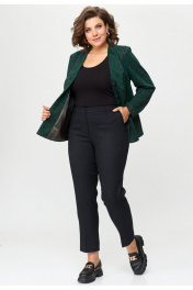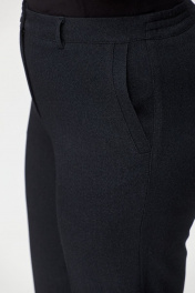 Брюки классические, из плотной текстильной ткани, прямые, слегка заужены к низу, заутюжены стрелки, по переду обработаны карманы с отрезным бочком, застежка на тесьму-молнию и 1 пуговицу. На задних половинках обработаны вытачки и имитация карманов в рамку с двумя обтачками, пояс в брюках притачной, с резинкой. По низу брюк в боковом шве есть небольшой разрез. Длина брюк от талии по боковому шву 96 см