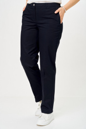 Костюм женский, 2-х предметный, состоит из жакета и  брюк. Выполнен из хлопковой ткани. Жакет женский удлиненный, силуэт свободный, с центральной бортовой застежкой на пуговицы до линии перегиба лацкана. Спереди отрезной бочок и карман с клапаном. Спинка цельная. Рукав втачной. Воротник пиджачного типа. Перед жакета на подкладке. Длина по спинке 75 см, длина брюк по боковому 102 см.