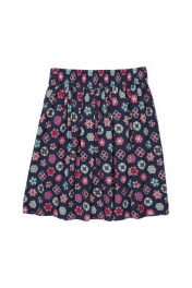 Юбка из плательной вискозы с набивкой мягкого силуэта на широкой эластичной ленте по линии талии и с двумя наконными боковыми карманами модной длины. Дополняет образ эффектная нашивка из металла цвета «золото».