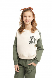 Молочный джемпер для девочки с круглым вырезом горловины. Манжеты и низ из рибаны. Вышивки, стразы и принты в дизайнерской стилистике капсулы "Армия стиля".