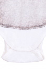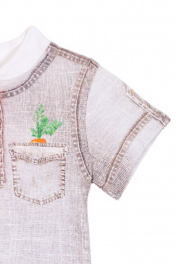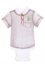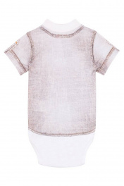 Белое боди для мальчика. Горловина дополнена воротником и застежкой на две пуговицы. Ткань изделия прямого силуэта имеет принт с имитацией джинсы.