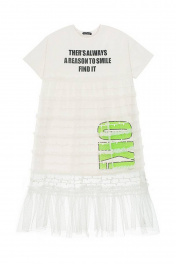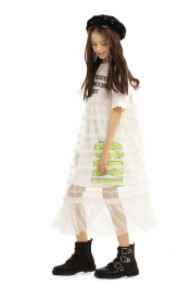 Молочное платье для девочки удлиненной конструкции с завышенной талией. Удлиненная майка oversize-силуэта и юбка из сетчатого полотна в рюши. Короткий рукав, круглый вырез горловины. Принты в стилистике капсулы "Event".