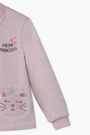 Меланжевый жакет для девочки с круглым вырезом горловины. Рукава из рибаны. Модель декорирована стразами, нашивкой и принтом в стилистике капсулы "Пушистые принцессы"