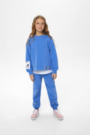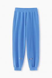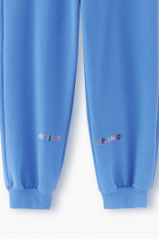 Стильные лазурные брюки-джоггеры для девочки. Широкая объёмная модель со средней посадкой на мягком поясе. Брюки из футера с браш-эффектом, что делает их мягкими и износостойкими. Джоггеры с манжеты внизу декорированы вышивкой в виде букв.