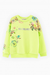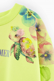 Свитшот сочного оттенка кибер лайм с дизайнерским принтом. Модель прямого силуэта. Приспущенная линия плеча. Горловина, манжеты и низ изделия из рибаны. Свитшот из футера с бархатистым эффектом. Декорирован стразами и отлетным элементом из сеточки