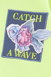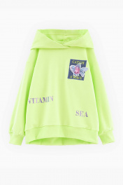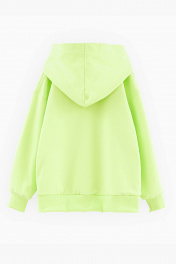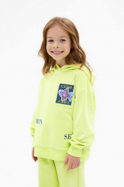 Худи сочного оттенка кибер лайм для девочки. Модель прямого силуэта. Спущенная линия плеча. Манжеты и низ изделия из рибаны. Худи из тактильно приятного футера. Декорировано стразами и вышивкой. Декоративная плёнка меняет оттенок при разном освещении