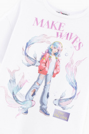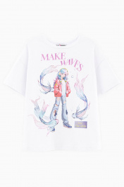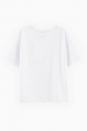 Белая футболка для девочки. Модель объёмного силуэта. Эластичная горловина из рибаны. Спущенная линия плеча. Футболка декорирована стразами и дизайнерским принтом в стиле акварельного рисунка. Декоративная плёнка меняет оттенок при разном освещении.