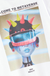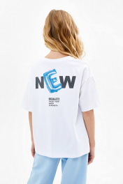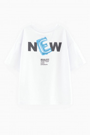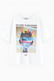 Белая футболка оверсайз для девочки. Модель объёмного силуэта. Эластичная горловина из рибаны. Спущенная линия плеча. Дизайнерский принт спереди и сзади изделия.
