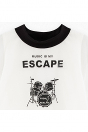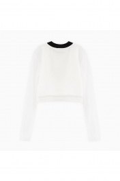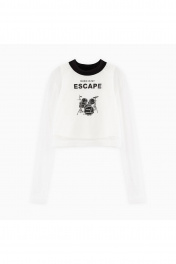 Укороченный лонгслив в оттенке молоко для девочки. Модель прилегающего силуэта. Воротник-стойка из эластичной рибаны. Комбинация материалов: кулирная гладь и нежное сетчатое полотно. Лонгслив декорирован авторской печатью.