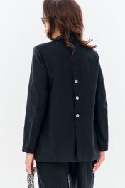 Женский брючный костюм – это универсальная одежда, которая подойдет для любого повседневного образа. Стильный и практичный женский комплект двойка, состоит из жакета и брюк. Выполнен из натуральной льняной ткани. Жакет слегка удлинен, свободного силуэта с коротким рукавом, декорирован спереди и сзади отлетными деталями и пуговицами.Спинка с высокой шлицей разрез которой можно регулировать с помощью пуговиц, по переду застежка пуговицы. Брюки прямые классические оформлены притачным поясом (есть резинка), по центру стрелки удлиняют визуально силуэт и делают образ изящнее.