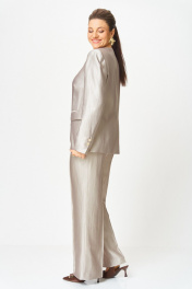Стильный женский костюм, выполнен в классическом стиле из ткани с небольшим блеском. Костюм состоит из жакета и брюк. Жакет полуприлегающего силуэта, по переду прорезные карманы с клапаном. Горловина «V» образная, застежка центральная на петли-пуговицы. По спинке в центральном шве отлетная шлица по низу. Рукава втачные, по низу отлетная шлица с декором из пуговиц. Жакет на подкладке. Брюки прямые от бедра, с застроченными стрелками по переду и спинке. Застежка по линии банта на молнию и крючок. Верх брюк на обтачке. Длина жакета – 69 см Длина рукава – 63 см Длина брюк по боковому срезу – 109 см Длина брюк по шаговому шву – 82 см